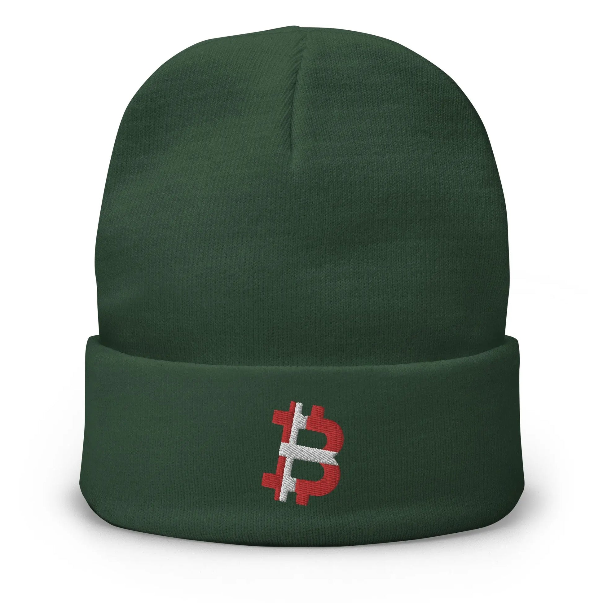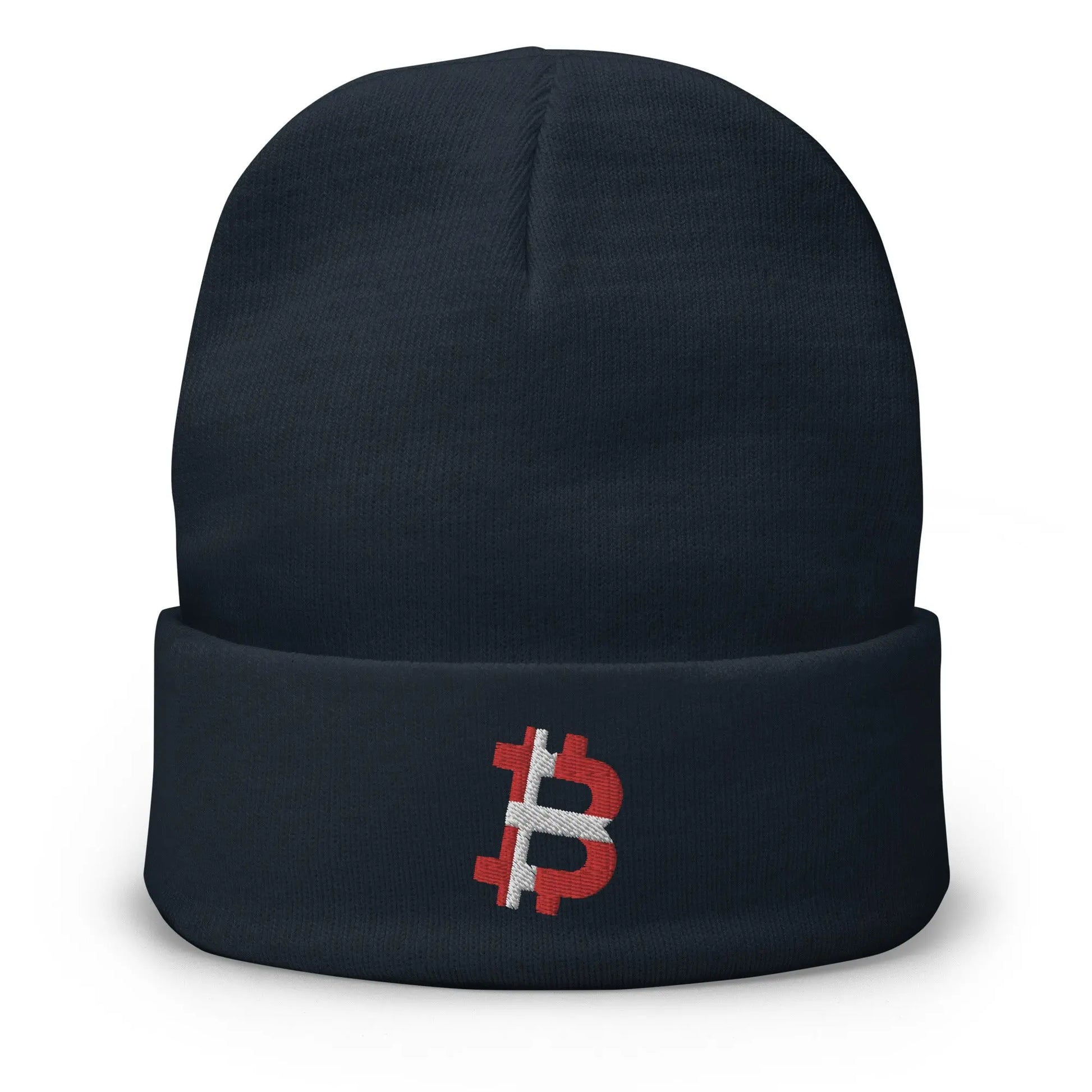 Expertly embroidered, the beanie features an integrated design of the Bitcoin symbol with the red and white hues of the Danish flag, making it a standout piece for both Bitcoin enthusiasts and Danish patriots.